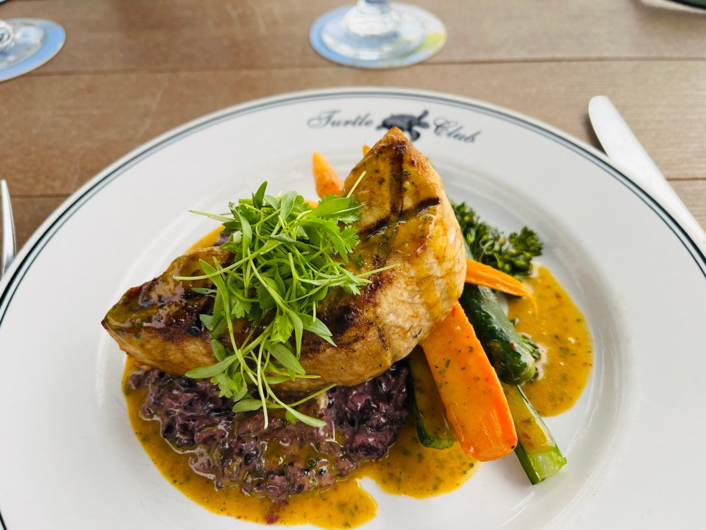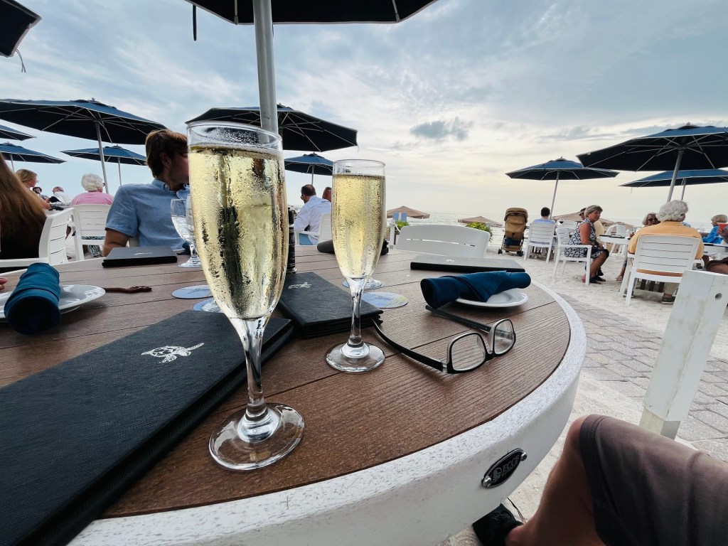 Heute erst Strand, hier konnten wir drei Manatees (Seekühe) spotten; die waren aber zu schnell für die Kamera, später dann vorgezogenes Hochzeitstags-Dinner im „Turtle Club“ direkt am Strand: