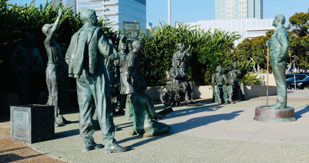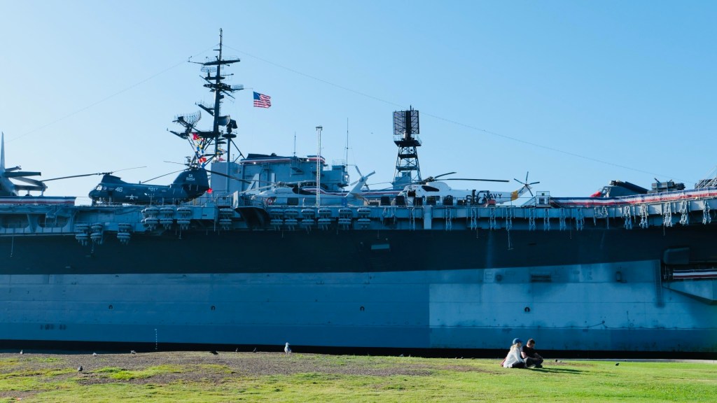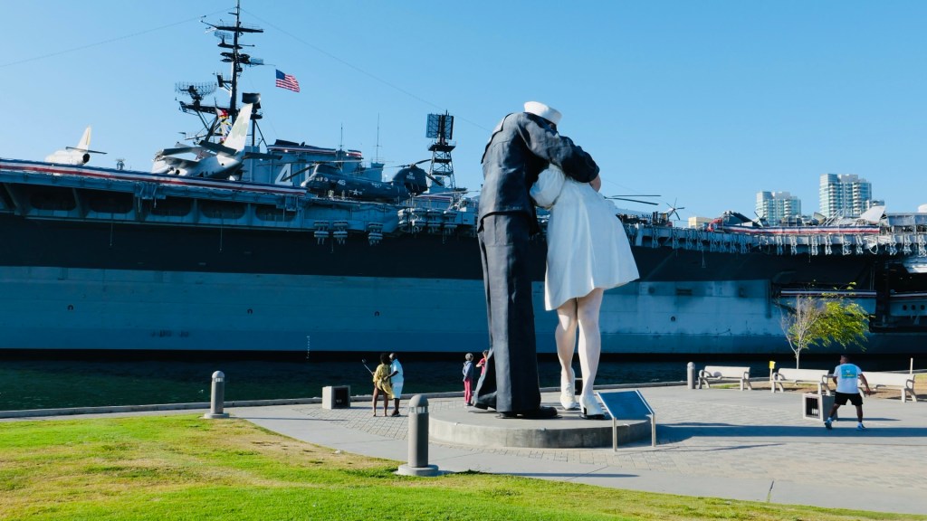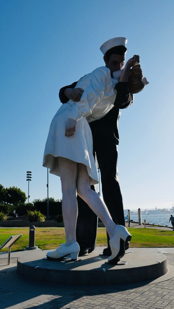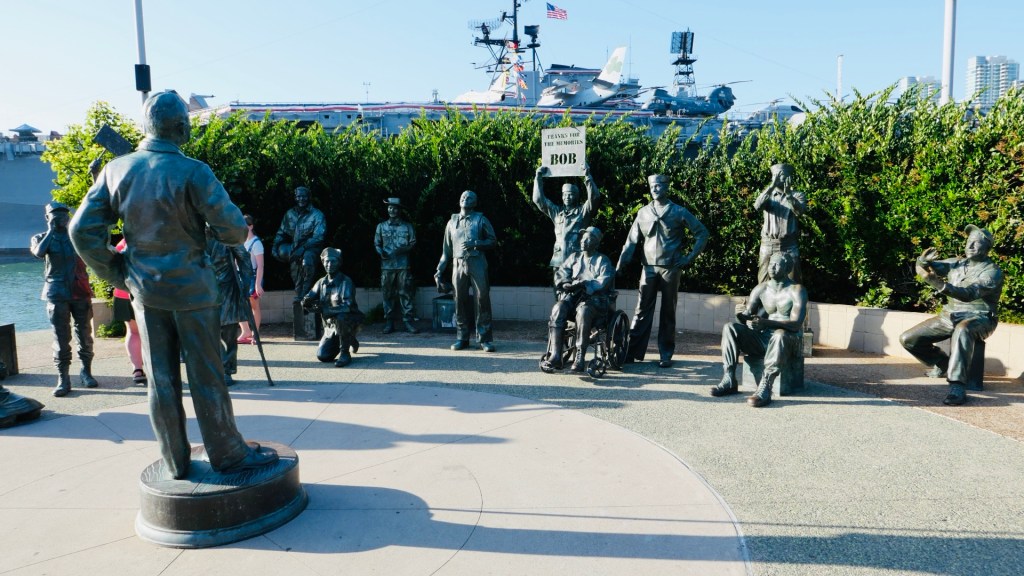 Nach dem Einchecken; die Vermieterin hat uns extra ein Brot gebacken und Obst aus Nachbar‘s Garten zur Verfügung gestellt🤩 ging’s in den Hafenbereich. Hier liegt der Flugzeugträger „USS Midway“, davor Denkmäler, unter anderem von Bob Hope.